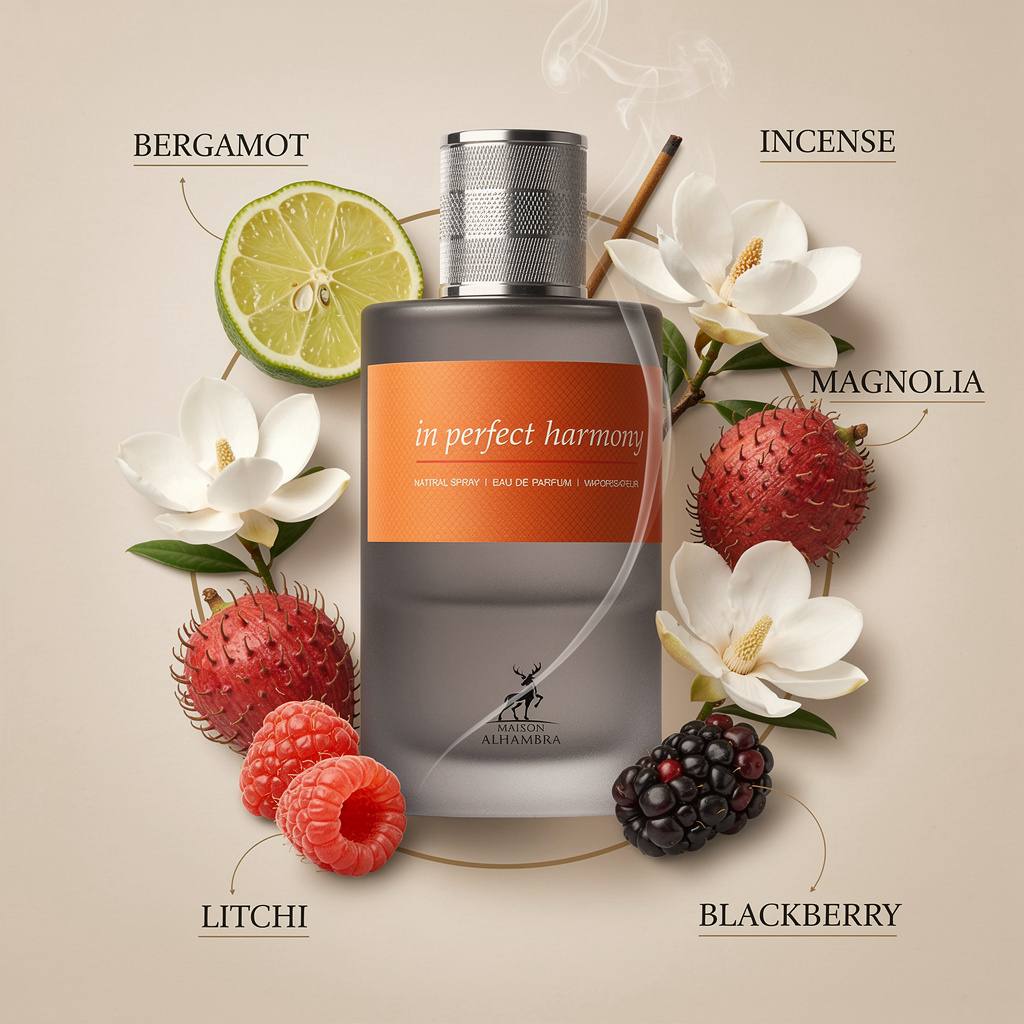 In Perfect Harmony عطری است متعادل، احساسی و خوشساخت که دقیقاً همانطور که از نامش پیداست، هارمونی بینقصی از میوه، گل و نتهای گرم و عمیق ایجاد میکند. با الهام از عطر Hibiscus Mahajád Maison Crivelli . عطری زنانه–مردانه که هم شیرینی دلنشین دارد، هم عمق و جذابیت؛ ترکیبی که هر لحظه روی پوست تغییر میکند و رنگ تازهای از رایحهاش را نشان میدهد.در شروع، ترکیب شاداب و میوهای شاهتوت، تمشک، ترنج و لیچی فضایی سرزنده و انرژیبخش میسازد. در قلب عطر، همراهی ماگنولیا، رز، بنفشه و عود حالوهوایی لطیف، عمیق و کمی رازآلود ایجاد میکند؛ رایحهای که خط بوی عطر را خاص و بسیار جذاب میکند. در نتهای پایانی نیز وانیل، عنبر و مشک گرما، نرمی و ماندگاری عطر را تضمین کرده و آن را تبدیل به امضایی ماندگار روی پوست میکند. ⁜رایحه اولیه : لیچی ، شاه توت ، تمشک و ترنج ⁜رایحه میانی : رز ، مگنولیا ، عود و بنفشه ⁜رایحه پایه : مشک ، عنبر و وانیل